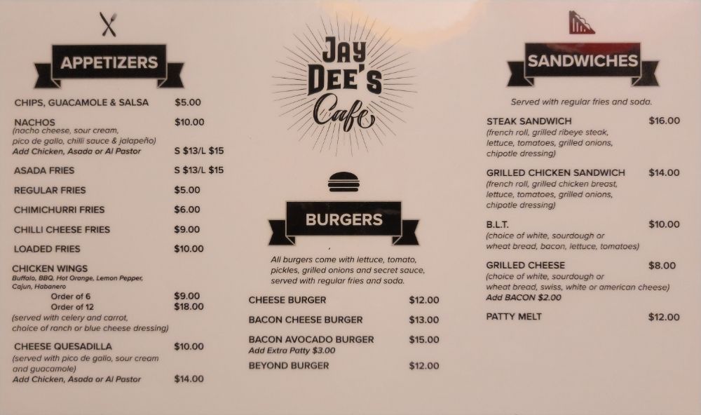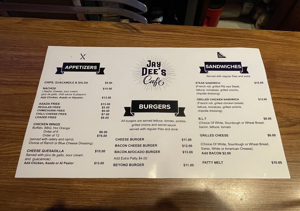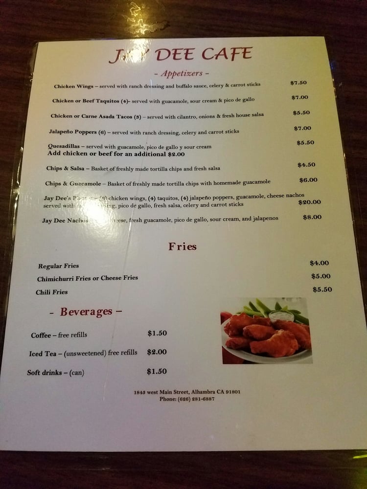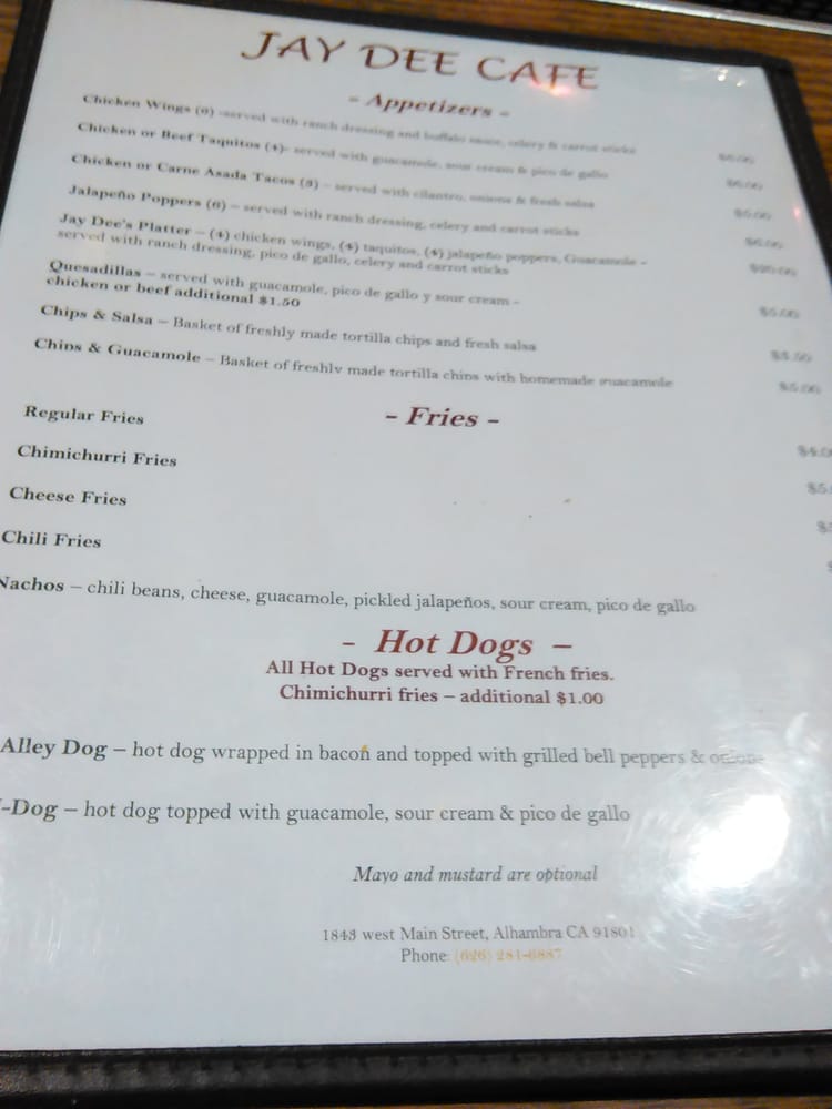 Jay Dee Cafe is a popular beer bar offering a casual, divey atmosphere with options for burgers and cafe items. Located in Alhambra, CA, this spot has a range of amenities including outdoor seating, pool table, and free Wi-Fi. The menu features a variety of dishes that have garnered rave reviews from customers. Highlights include the cheeseburger, steak sandwich, and menudo. The food is described as delicious, flavorful, and outstanding. Customers praise the strong drinks, reasonable prices, and friendly staff. The bar also offers a range of entertainment options like TouchTunes jukebox and TV. Overall, Jay Dee Cafe is a great spot for a relaxed afternoon or evening with good food, drinks, and company.